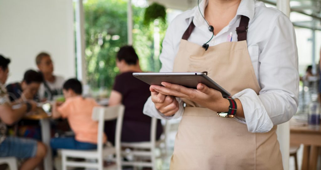 Service waiter servicing the customer at cash point in cafe.