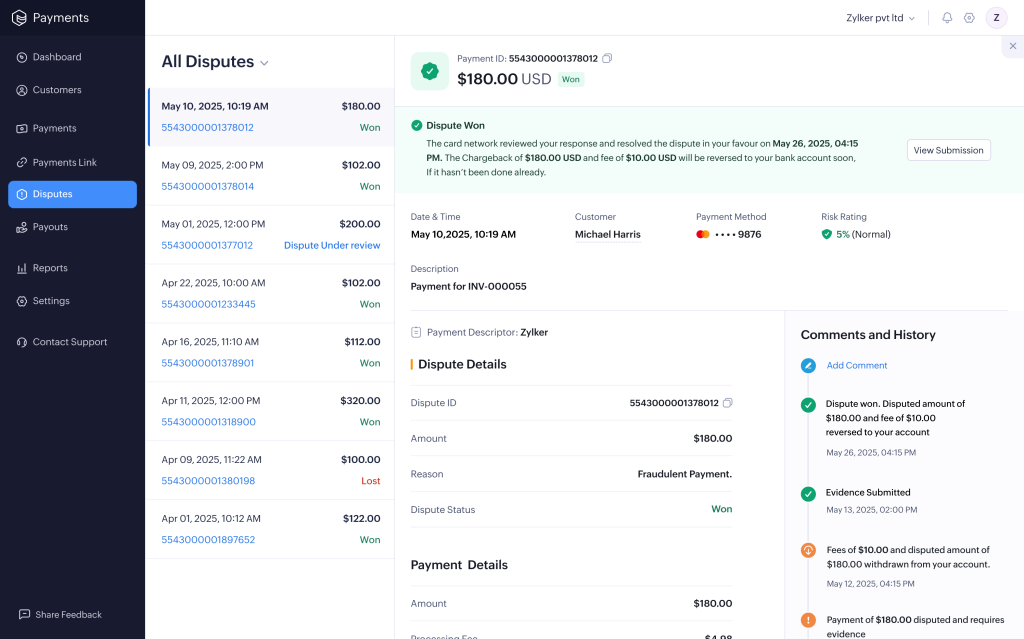 Zoho Payments is PCI DSS Level 1 compliant and supports robust fraud protection to minimize chargebacks. With automated reconciliation features, finance teams can reduce time spent on manual processes and mitigate potential errors.