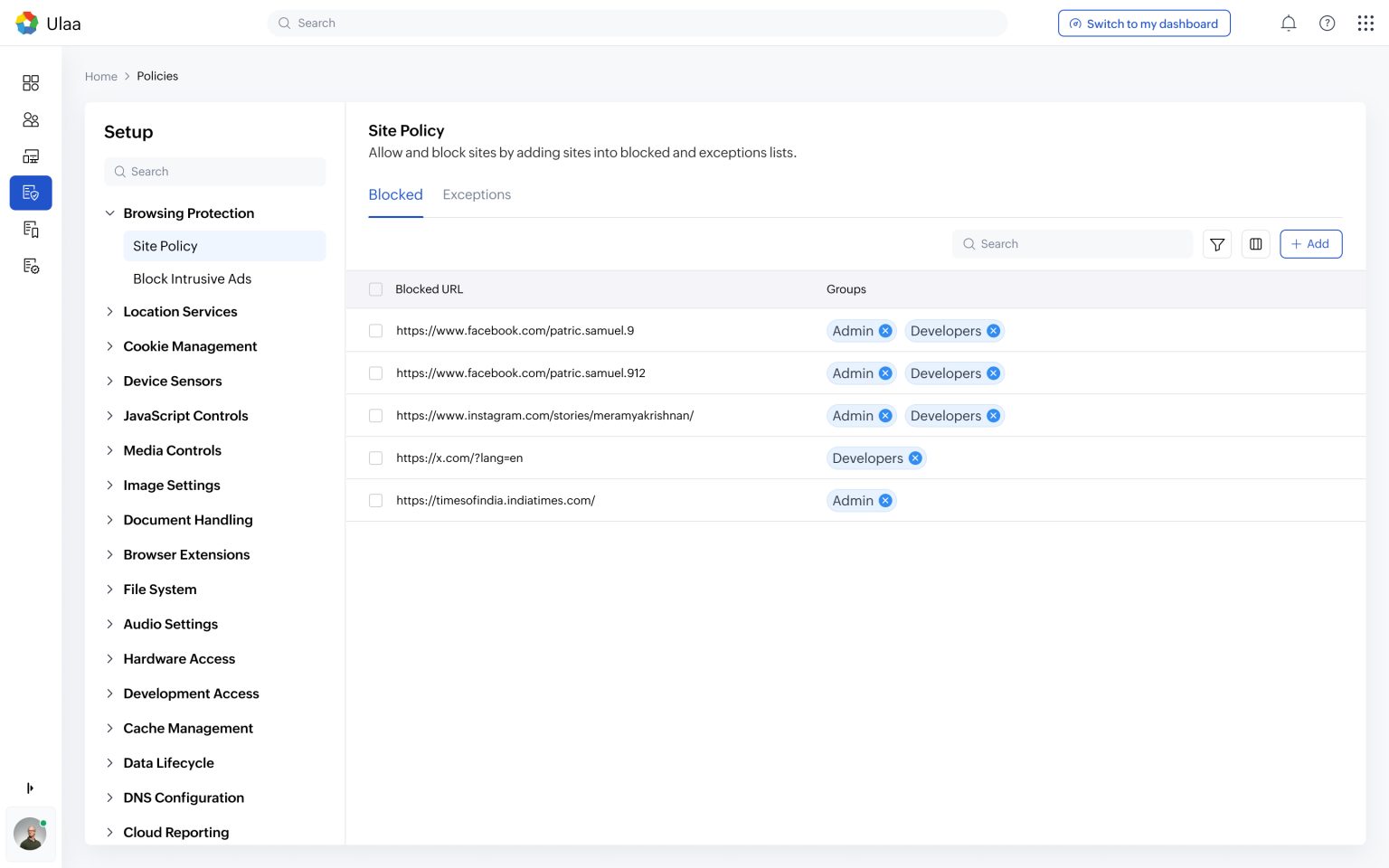 Ulaa Enterprise provides centralized policy management, enabling administrators to set access controls, manage extensions, restrict downloads, and define user behavior across user groups. The browser also features Data Loss Prevention (DLP) capabilities that block unauthorized uploads, screen captures, copy-paste actions, and downloads of sensitive data.